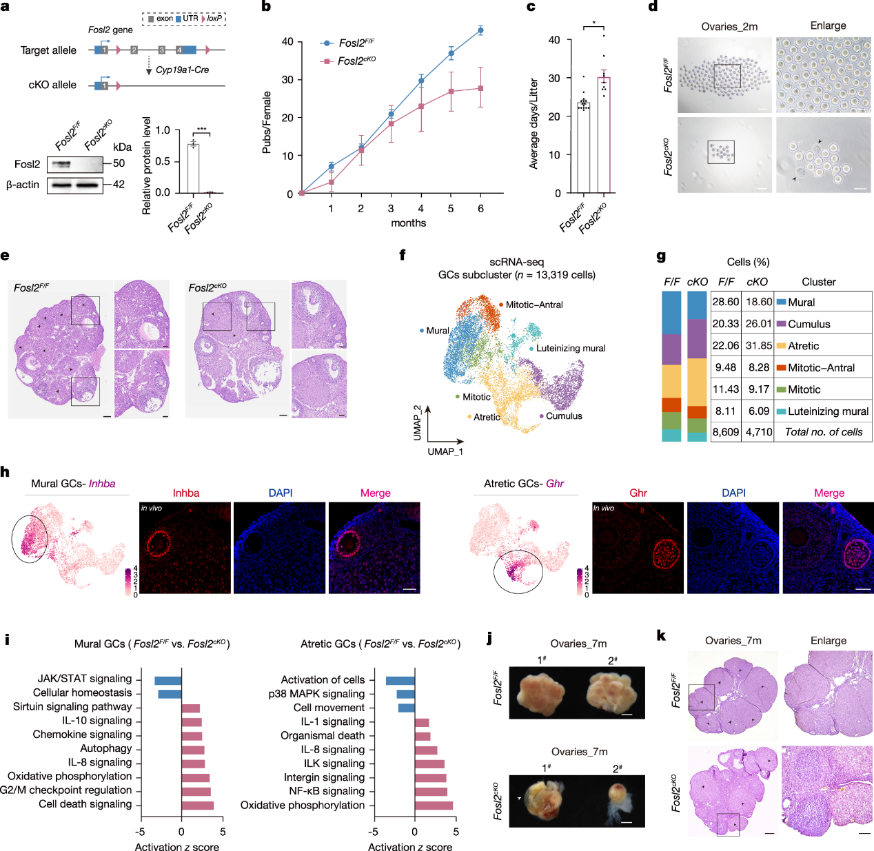 通过构建颗粒细胞特异性Fosl2条件敲除小鼠,发现其繁殖能力显著下降。Fosl2缺陷小鼠对促性腺激素的敏感性降低,超排卵效率下降。单细胞RNA测序分析显示,颗粒细胞可分为6个亚群,Fosl2缺失后颗粒细胞亚群数量显著减少,其中具有内分泌功能的壁层颗粒细胞比例下降,闭锁颗粒细胞比例升高,卵丘颗粒细胞比例略有增加,表明Fosl2对维持颗粒细胞亚群平衡至关重要。壁层颗粒细胞和闭锁颗粒细胞中,与年龄相关的促炎应激通路上调,发育通路下调,提示Fosl2可能参与卵巢衰老调控。7月龄Fosl2缺陷小鼠的卵巢出现严重结构紊乱,包括空泡化和体积缩小,黄体数量显著减少,证实Fosl2缺失加剧卵巢衰老,且对老年小鼠卵巢功能的影响更为严重。