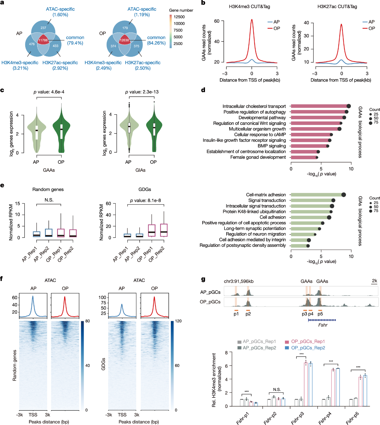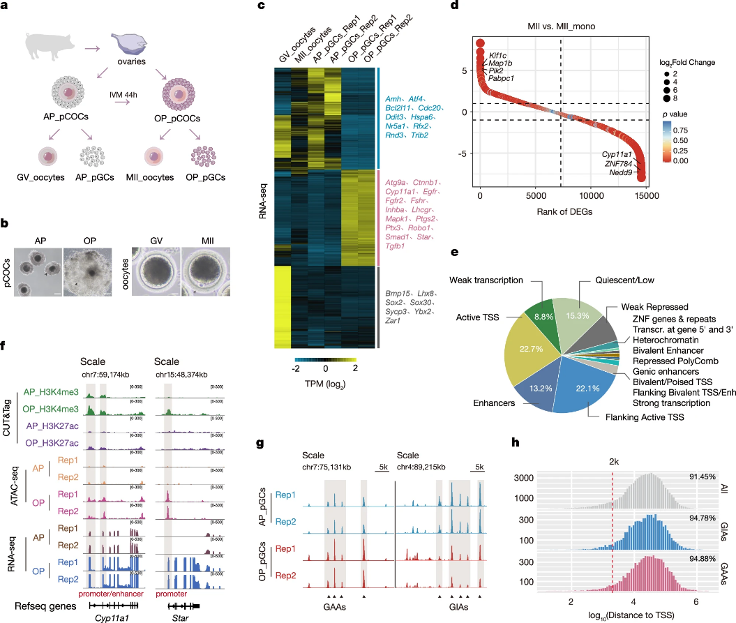 猪颗粒细胞差异可及性区域分析,鉴定出超过10,000个差异可及性区域,包括8646个颗粒细胞激活型可及性区域(GAAs)和7954个颗粒细胞失活型可及性区域(GIAs)。这些差异可及性区域主要位于转录起始位点附近约2kb的基因间区,与ATAC-seq峰的启动子占据特征一致。排卵前期,GAAs侧翼基因的H3K4me3和H3K27ac信号增强,而GIAs侧翼基因的组蛋白修饰水平降低。表达分析证实,GAAs邻近基因表达上调,GIAs邻近基因表达下调,表明启动子区域的染色质可及性与基因表达密切相关。