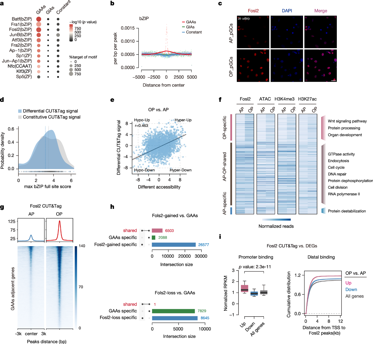 利用HOMER算法对GAAs中的调控元件motif进行富集分析,发现排名靠前的motif与激活蛋白1(AP-1)和锌指蛋白(ZF)的共有结合位点高度同源,其中AP-1 motif特异性富集于GAAs。作者通过筛选卵泡成熟过程中 pGCs 的 AP-1 转录因子表达变化,锁定了Fosl2,其mRNA和蛋白水平在颗粒细胞从窦状期到排卵前期显著升高,免疫荧光结果也证实排卵前期Fosl2的荧光强度增强。CUT&Tag分析表明,Fosl2在全基因组范围内的结合信号随卵泡成熟显著增加,且差异结合峰的motif得分低于组成型结合峰,提示Fosl2表达升高可结合低亲和力位点。差异染色质可及性峰与Fosl2结合峰高度相关,排卵前期特异性的Fosl2获得性峰与新开放的染色质区域及活性调控区域相关,且富集于发育相关基因附近。约75%的GAAs与Fosl2获得性峰重叠,Fosl2结合选择性富集于上调基因的启动子区域及远端区域,表明Fosl2作为转录激活因子,在调控GAAs重塑中发挥核心作用。