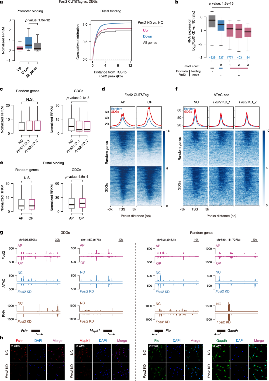 随后作者分析了小鼠颗粒细胞(mGCs)中携带Fosl2的GAA 模式,与猪颗粒细胞的研究结果一致,证实Fosl2调控卵泡成熟的机制在哺乳动物中保守。